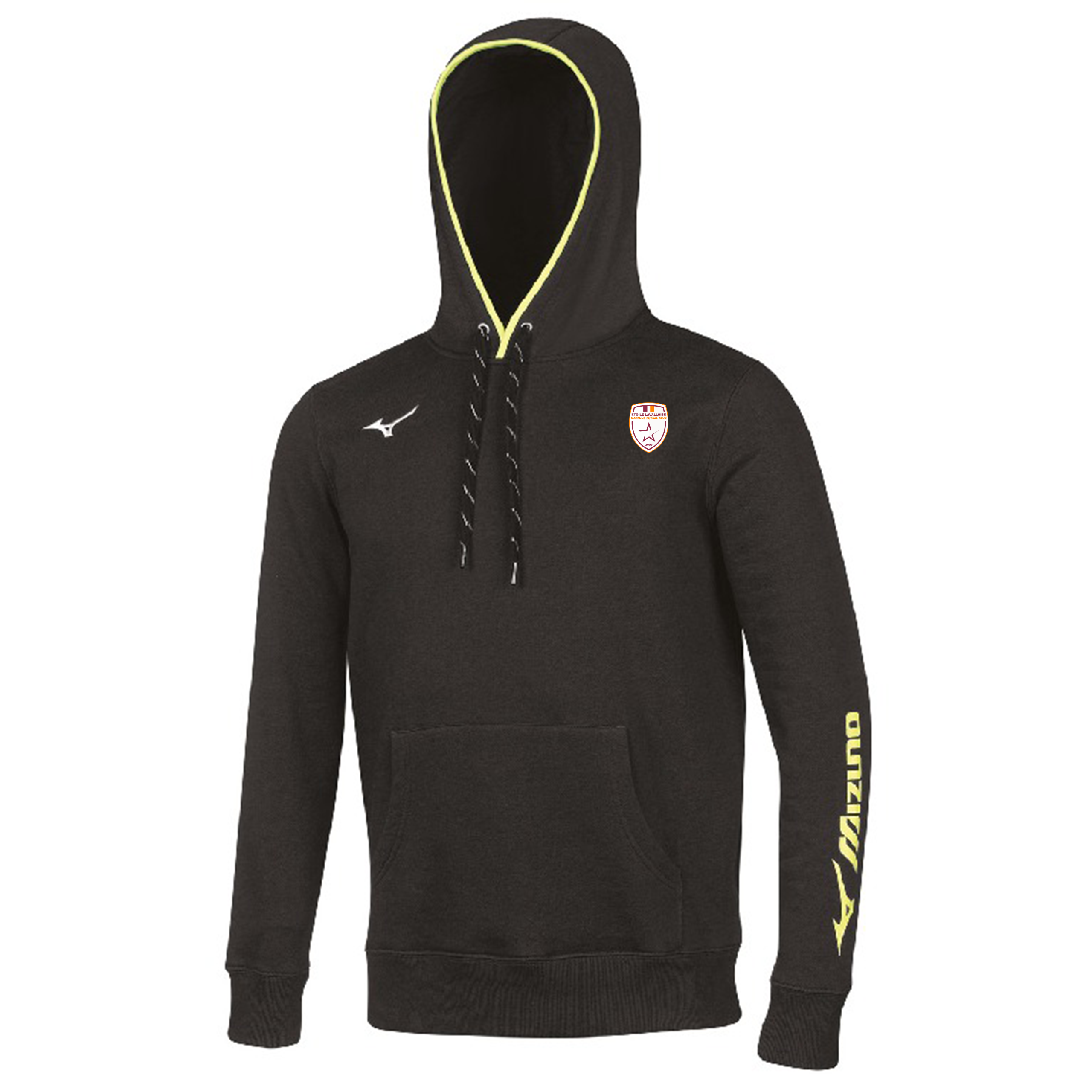 This Team Mizuno Sweat Hoodie is a classic model with pouch pocket and hood. With contrasting colours on the hood, drawstrings, ribbed hem and cuffs. Material: 80% cotton, 20% polyester. With the logo of Étoile Lavalloise Mayenne Futsal Club, you express your support for the team.